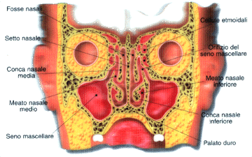 La CARTILAGINE QUADRANGOLARE, la lamina perpendicolare dell'etmoide situata posteriormente ad essa e il vomere in basso costituiscono il cosiddetto SETTO NASALE che separa l'una dall'altra le due fosse nasali o cavità nasali. In ognuna delle cavità nasali si possono distinguere quattro pareti. La parete MEDIALE è costituita dal setto nasale, la parte inferiore o pavimento della fossa nasale è costituita da processo palatino del mascellare e dalla lamina orizzontale dell'osso palatino. La parete laterale presenta tre lamine ossee convesse medialmente, lateralmente connesse alla parete laterale delle cavità nasali, rivestite da mucosa che prendono il nome di TURBINATI. La lamina ossea che costituisce i turbinati è rivestita da mucosa microscopicamente caratterizzata da un epitelio cilindrico stratificato con presenza di cellule CILIATE e CALICIFORMI MUCIPARE. La sottomucosa presenta uno stato vascolo-ghiandolare con le caratteristiche del tessuto cavernoso erettile. I turbinati posseggono una estremità anteriore o TESTA DEL TURBINATO ed una estremità posteriore CODA DEL TURBINATO.